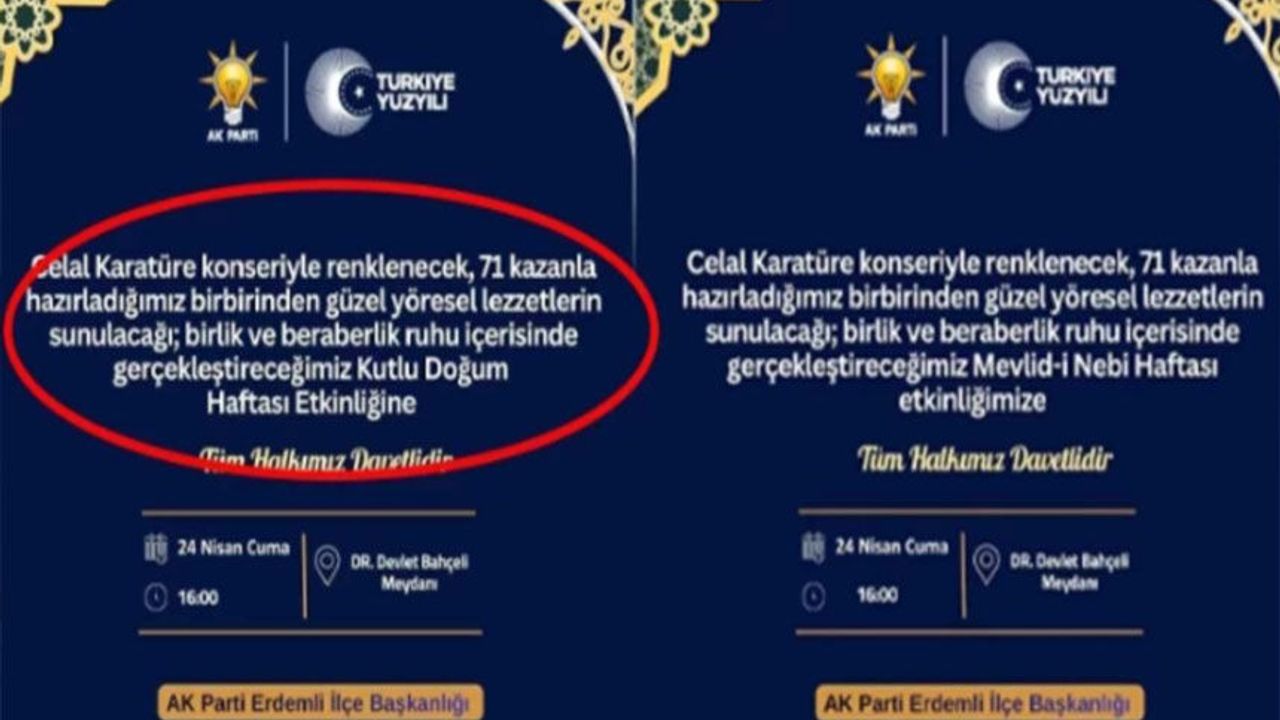 Mersin’in Erdemli ilçesinde AKP İlçe Başkanlığı’nın düzenlediği etkinliğe ait davetiye, kamuoyunda tartışma yarattı. Davetiyede, geçmişte 'FETÖ ile ilişkilendirilerek' kullanımdan kaldırılan 'Kutlu Doğum Haftası' ifadesinin yer alması sosyal medyada tepki çekti.