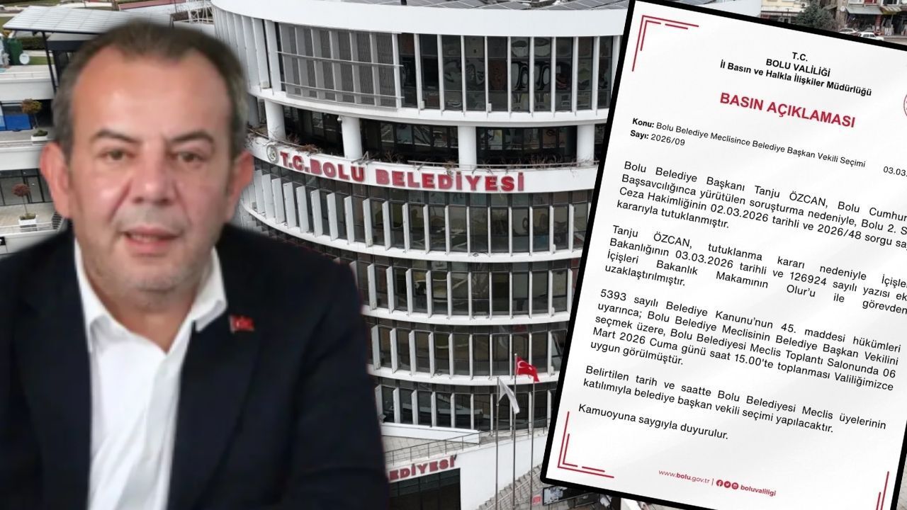 "Bolu Belediye Başkanı Tanju Özcan, Bolu Cumhuriyet Başsavcılığınca yürütülen soruşturma nedeniyle, Bolu 2. Sulh Ceza Hakimliğinin 02.03.2026 tarihli ve 2026/48 sorgu sayılı kararıyla tutuklanmıştır. Tanju Özcan, tutuklanma kararı nedeniyle İçişleri Bakanlığı'nın 03.03.2026 tarihli ve 126924 sayılı yazısı eki İçişleri Bakanlık Makamının Olur’u ile görevden uzaklaştırılmıştır. 5393 sayılı Belediye Kanunu’nun 45. maddesi hükümleri uyarınca; Bolu Belediye Meclisinin Belediye Başkan Vekilini seçmek üzere, Bolu Belediyesi Meclis Toplantı Salonunda 06 Mart 2026 Cuma günü saat 15.00'te toplanması Valiliğimizce uygun görülmüştür. Belirtilen tarih ve saatte Bolu Belediyesi Meclis üyelerinin katılımıyla belediye başkan vekili seçimi yapılacaktır."