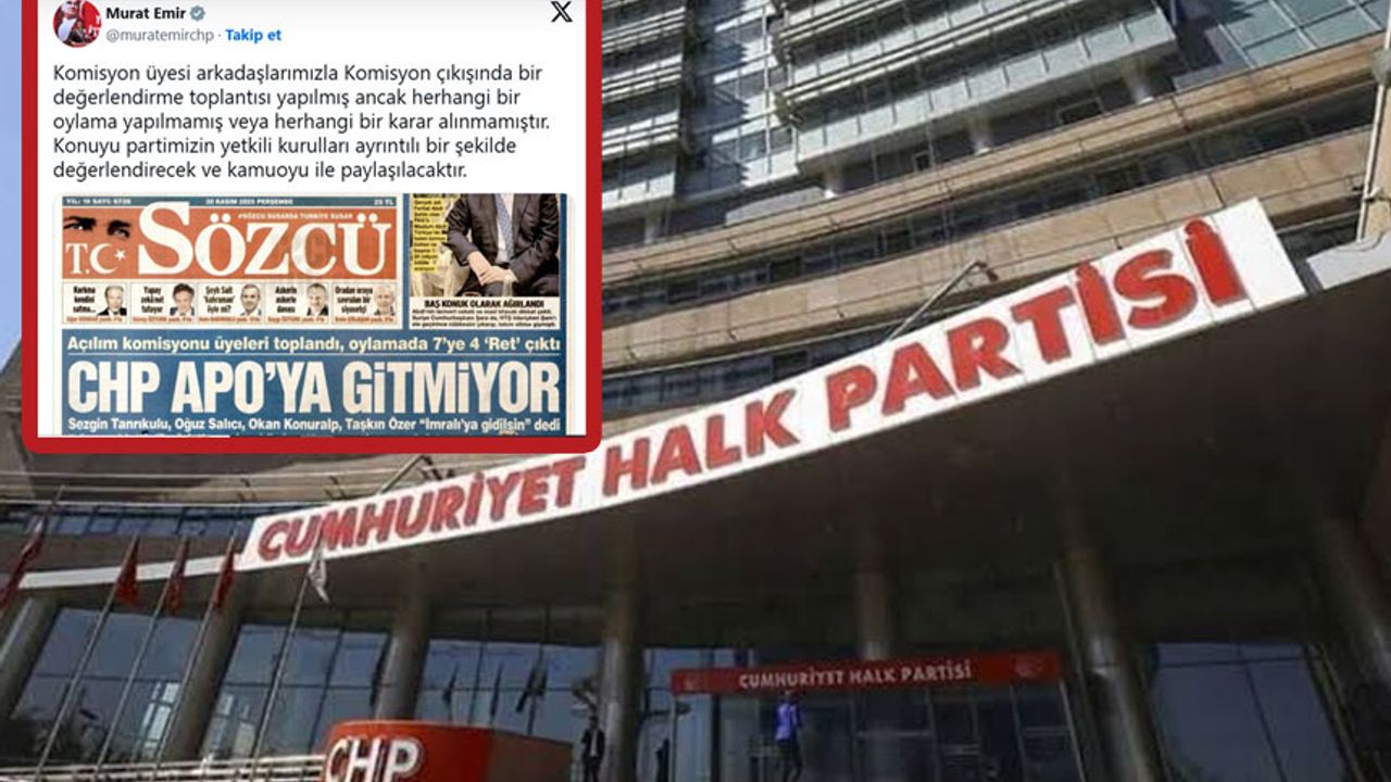 CHP Grup Başkanvekili Murat Emir, Sözcü Gazetesi'nin manşetten verdiği "İmralı ziyareti için oylama yapıldı" iddialarına sosyal medya hesabından yanıt verdi. Gazetenin küpürünü de paylaşan Murat Emir, şöyle yazdı: