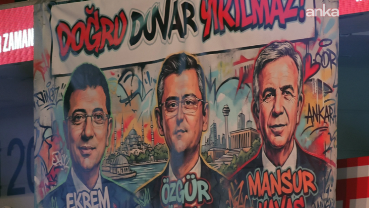 CHP’nin "Şimdi İktidar Zamanı" Kurultayı’nda, Özgür Özel, Ekrem İmamoğlu ve Mansur Yavaş'ın resimlerinin olduğu “Doğru duvar yıkılmaz” pankartı asıldı.