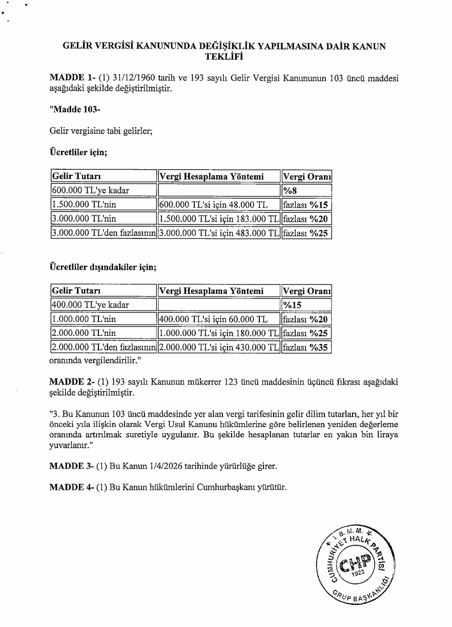 CHP Niğde Milletvekili Ömer Fethi Gürer, gelir vergisi tarifesinde değişiklik yapılmasını öngören kanun teklifini Türkiye Büyük Millet Meclisi Başkanlığına sundu. Gürer, yüksek enflasyon koşullarında ücretli çalışanların vergi sistemi nedeniyle daha ağır bir yük altına girdiğini belirterek düzenlemenin çalışanların net gelir kaybını azaltmayı ve vergi adaletini güçlendirmeyi hedeflediğini söyledi.