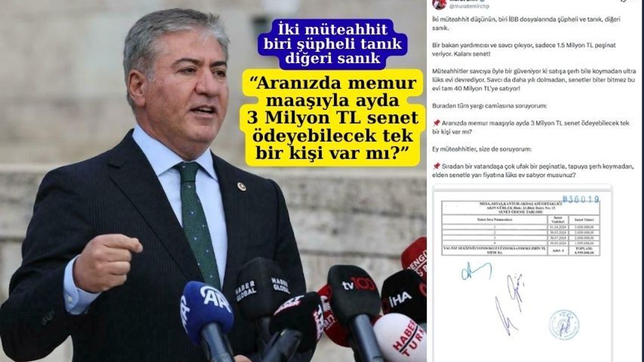 "İki müteahhit düşünün, biri İBB dosyalarında şüpheli ve tanık, diğeri sanık. Bir bakan yardımcısı ve savcı çıkıyor, sadece 1,5 milyon lira peşinat veriyor. Kalanı senet.