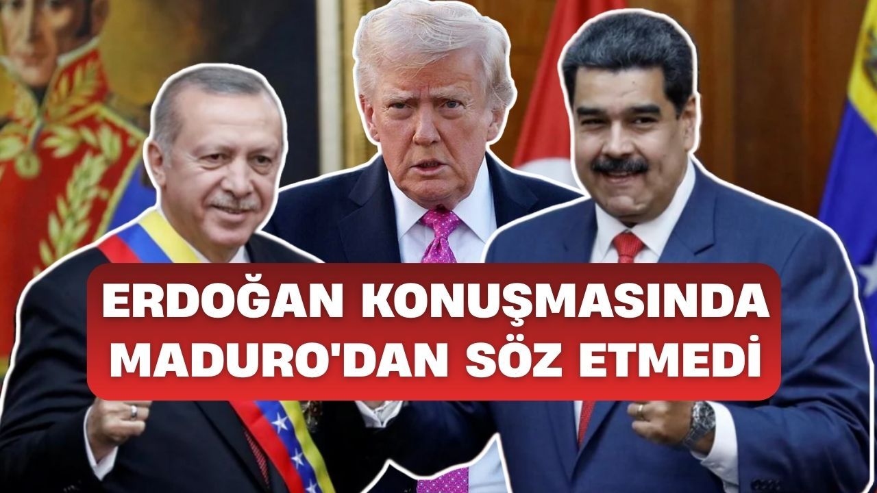 Erdoğan, kendisine 'dostum' diye hitap eden Venezuela Devlet Başkanı Nicolas Maduro'nun ABD tarafından yakalanması ve ülke dışına çıkarılmasına konuşmasında değinmedi.