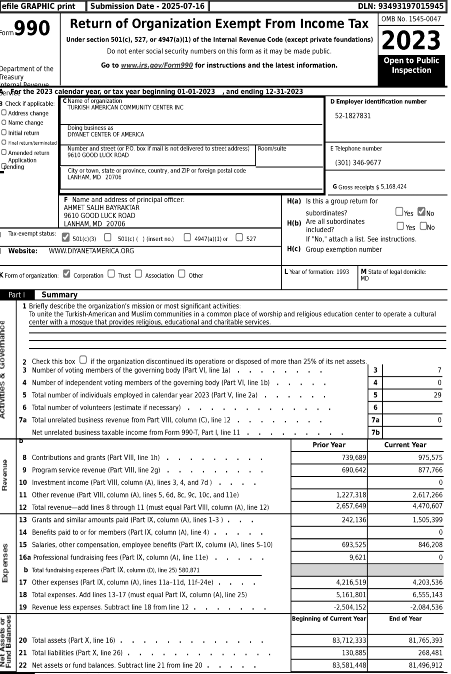 2023 yılı vergi bildirimine göre, Diyanet Center of America, ‘4 milyon 470 bin 607 dolar’ gelir beyan etti. Buna karşılık, ‘6 milyon 555 bin 143 dolar’ hacama yapmış. Böylece Diyanet 2023 yılını 2 milyon dolar açıkla kapatmış oluyor.