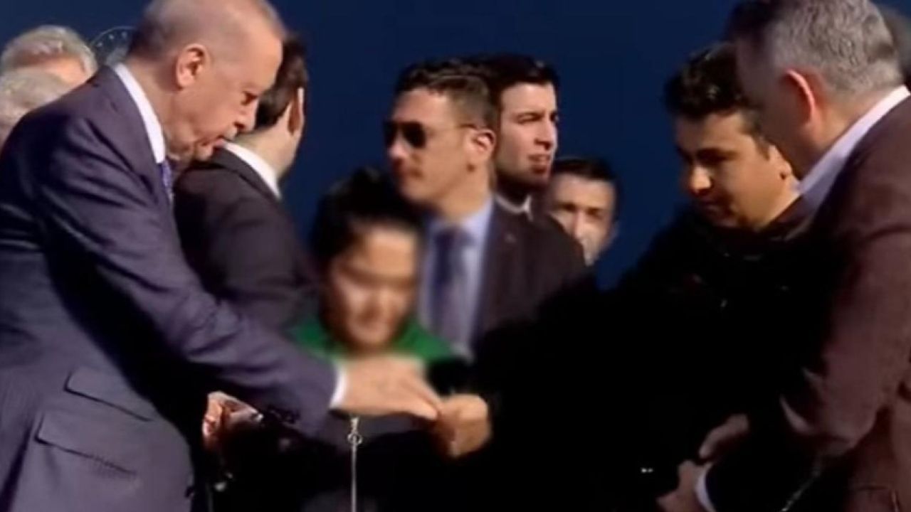 Erdoğan önce kız çocuğuna ardından elini öpen babasına 200 TL harçlık verdi.