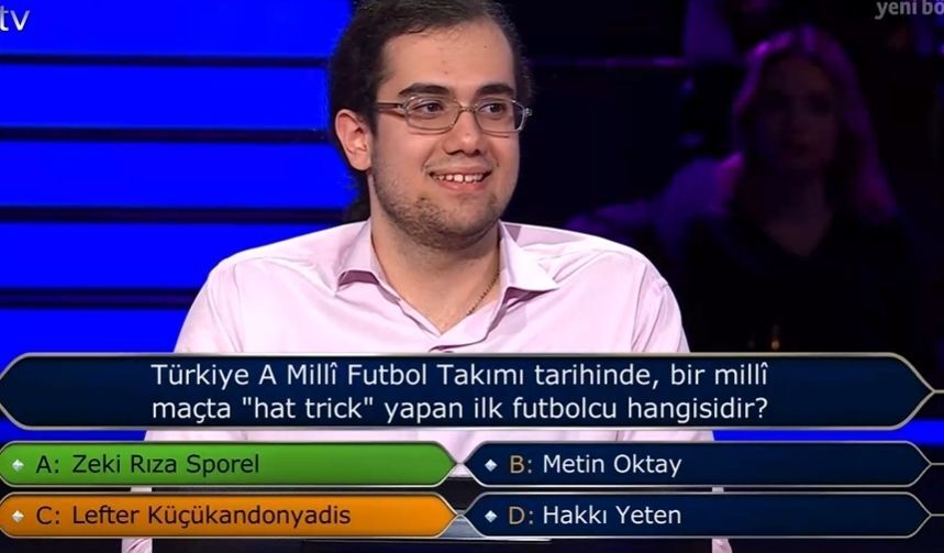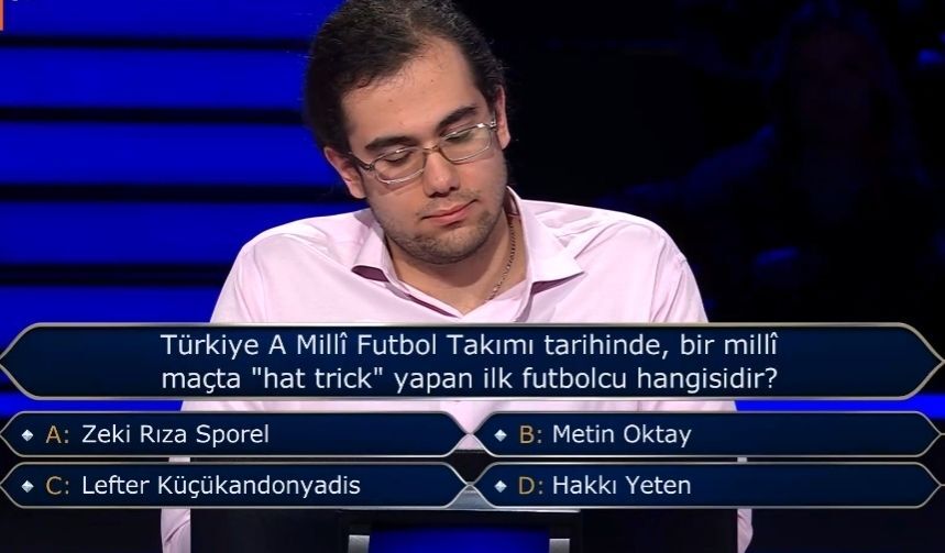 Ahmet Bera Sevim'in 1 milyon ödüllü soruda karşısına, "Türkiye A Millî Futbol Takımı tarihinde, bir millî maçta "hat trick" yapan ilk futbolcu hangisidir?" sorusu çıktı.