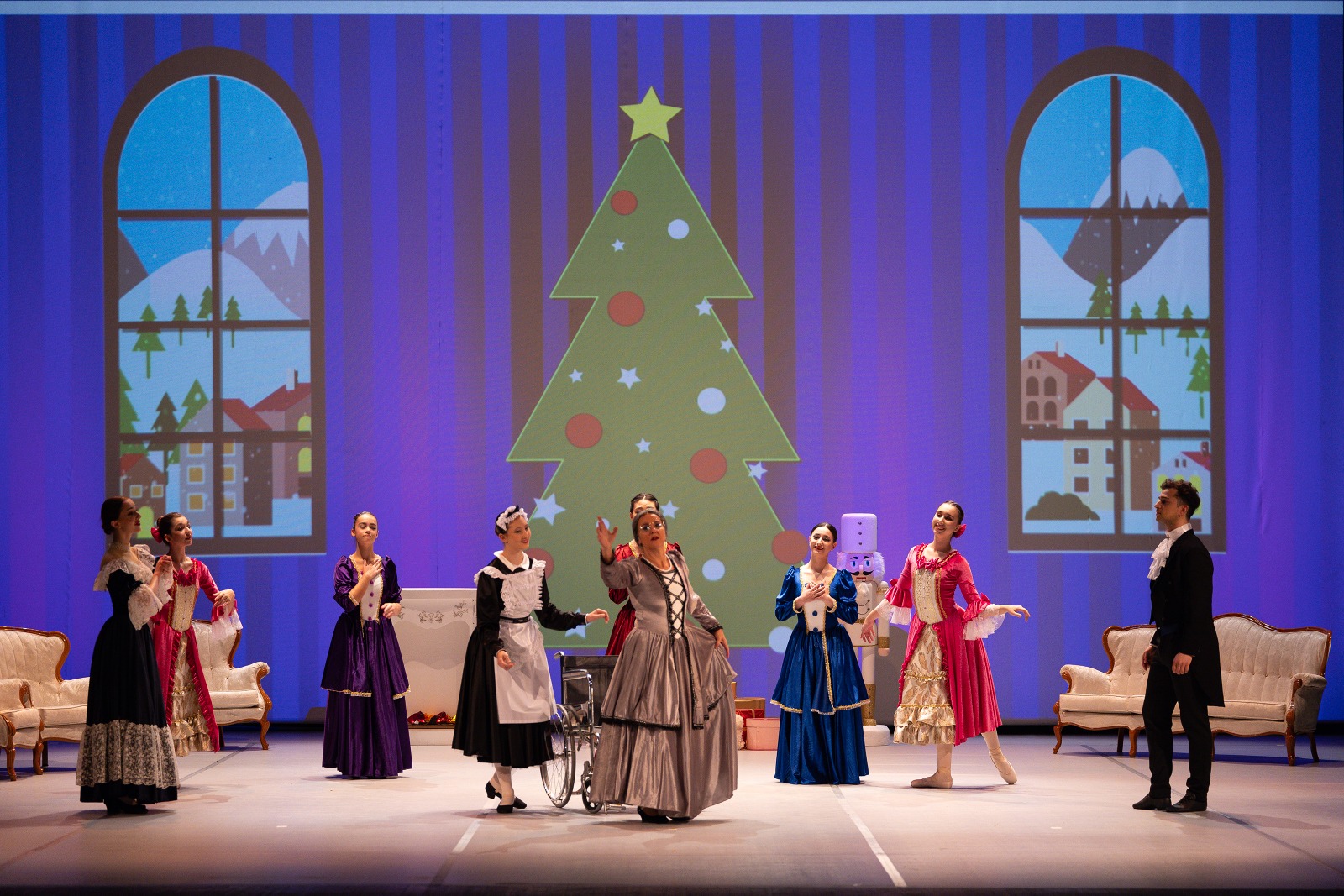 Stahlbaum evindeki yılbaşı kutlaması sahnesi. Dekor ve kostümlerle “aile, hediye ve masal” duygusu sahneye taşınıyor.