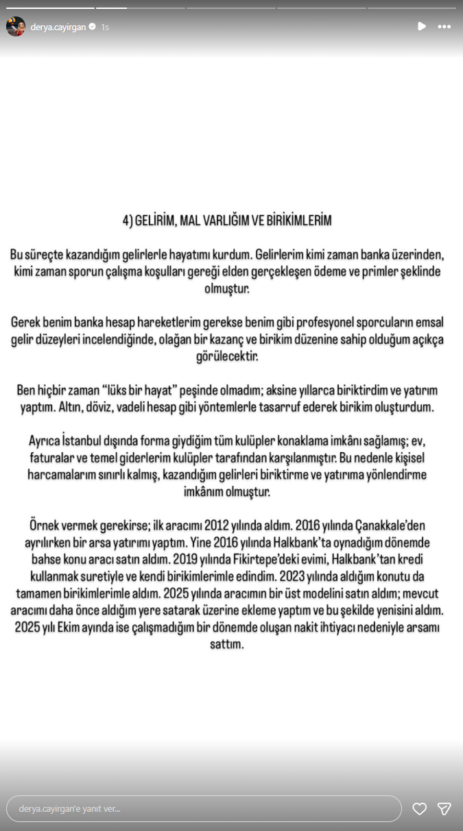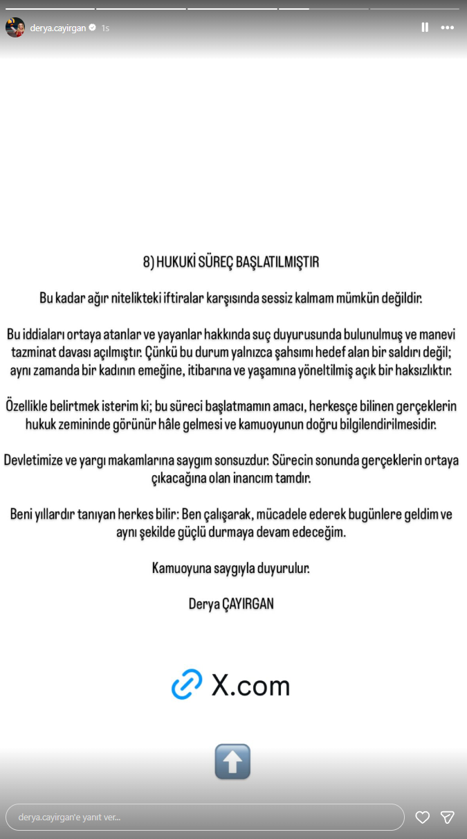 Çayırgan yaptığı paylaşımda "Bu kadar ağır nitelikteki iftiralar karşısında sessiz kalmam mümkün değildir. Bu iddiaları ortaya atanlar ve yayanlar hakkında suç duyurusunda bulunulmuş ve manevi tazminat davası açılmıştır. Çünkü bu durum yalnızca şahsımı hedef alan bir saldırı değil; aynı zamanda bir kadının emeğine, itibarına ve yaşamına yöneltilmiş açık bir haksızlıktır" ifadesini kullandı. İşte Derya Çayırgan'ın paylaşımı;