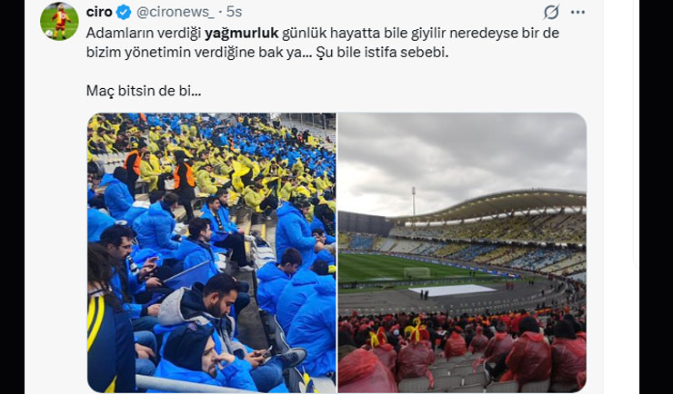 Bir taraftar, Fenerbahçe ile Galatasaray yönetimlerinin dağıttığı yağmurluklar arasındaki fiyat karşılaştırması yaptı. "Galatasaray'ın taraftarına verdiği basit yağmurluk ile Fenerbahçe'nin verdiği kaliteli yağmurluk yan yana. Dursun Özbek yönetiminin 'taraftar değeri' anlayış, rakip kulüple kıyaslandığında içler acısı durumda."