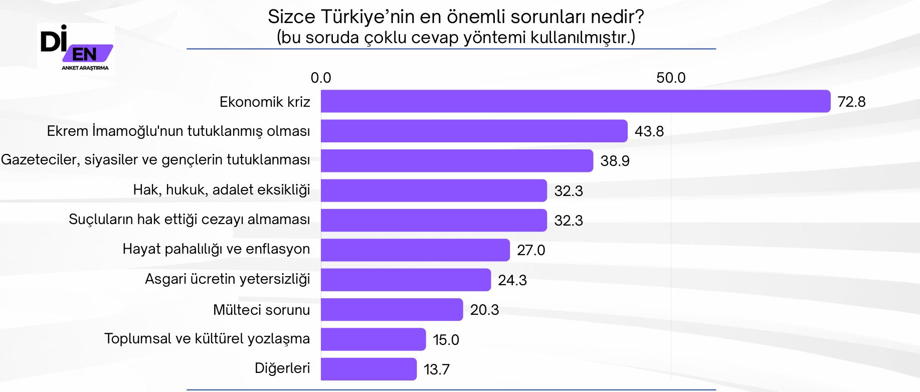Araştırmada Türkiye'nin en büyük sorunu sorusunda 'Ekonomik kriz' hal en başta bulurken arkasından Ekrem İmamoğlu'nun tutuklanması geldi. En büyük sorunlar seçeneklerinde sırasıyla gazetecilerin, siyasiler ve gençlerin tutuklanması ve hak hukuk adalet ile ilgili sorunların gelmesi dikkat çekti.