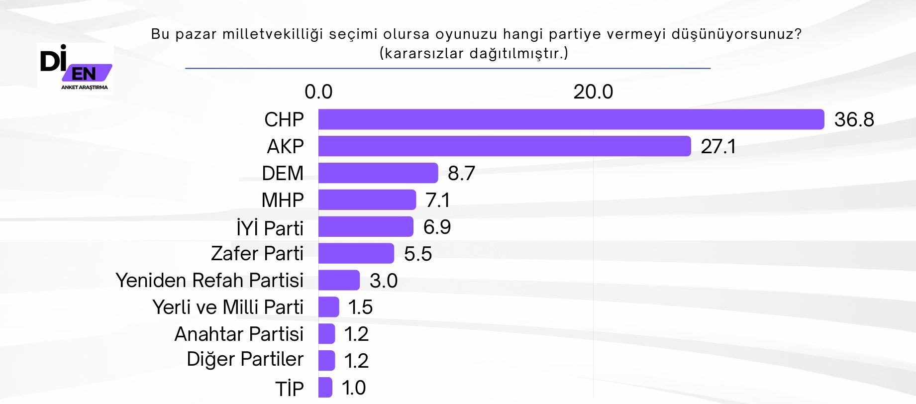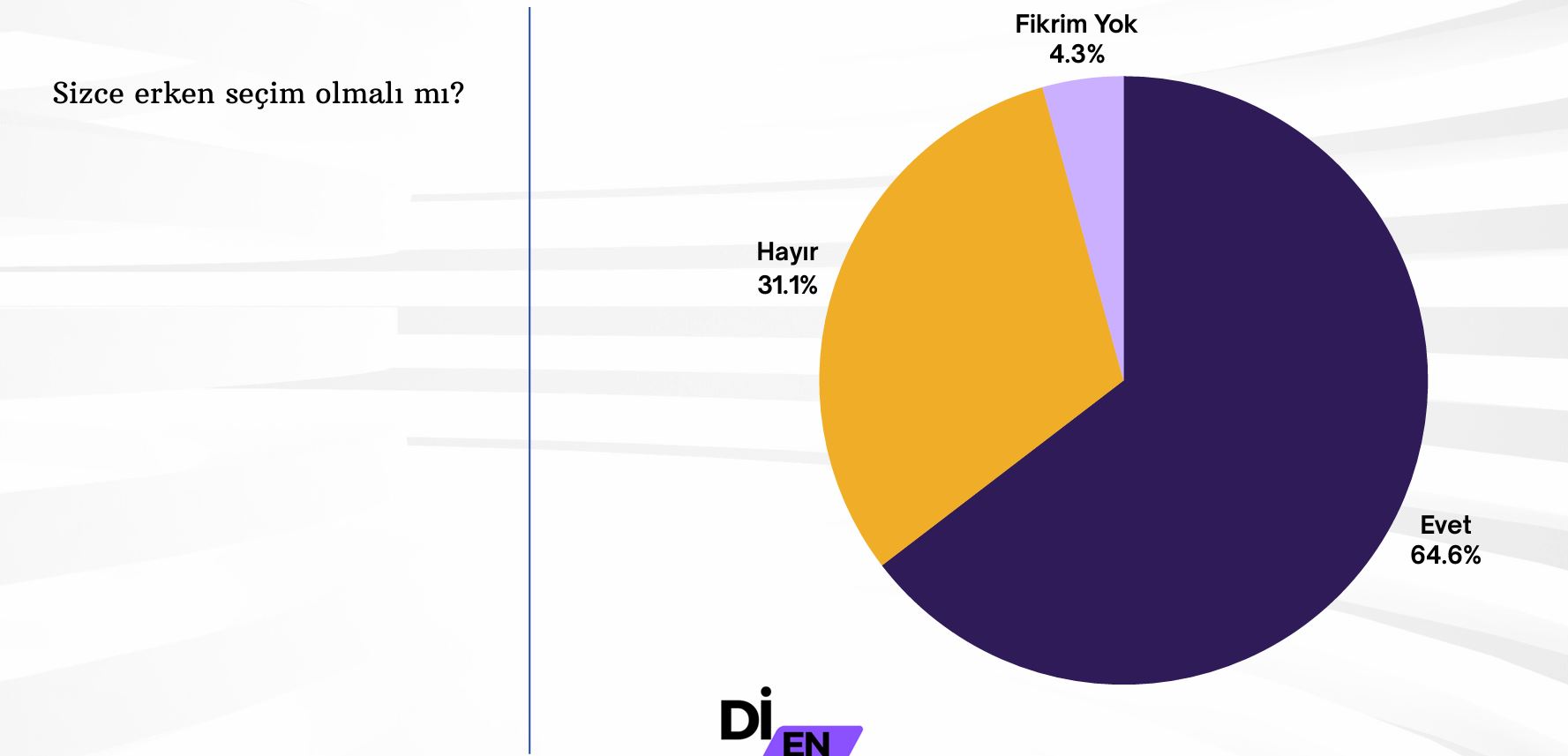 Di-En Araştırma şirketi 28 Mayıs-1 Haziran tarihleri arasında yaptığı anketin sonuçlarını yayınladı. Araştırma raporunda "Bu çalışma, 28 Mayıs-1 Haziran 2025 tarihleri arasında 16 il merkezi ve kırsal alanda gerçekleştirilmiştir ve toplamda 2828 katılımcıdan oluşmaktadır. " denildi.