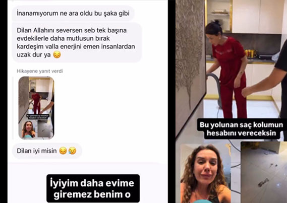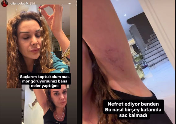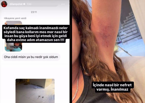 Dilan Polat paylaşımına, "Kafamda saç kalmadı. Neler söyledi bana. Kollarım mosmor. Nasıl bir insan bu.. Güya beni iyi etmek için geldi, daha evime adım atamazsın sen. İçinde nasıl bir nefret varmış, inanılmaz" diye devam etti.