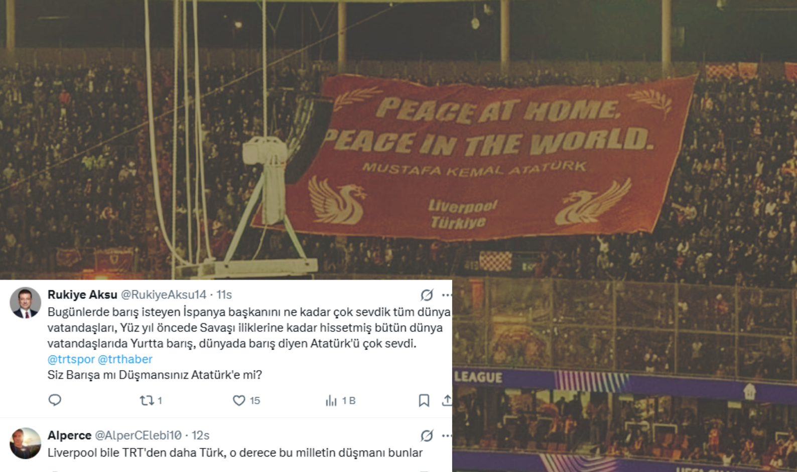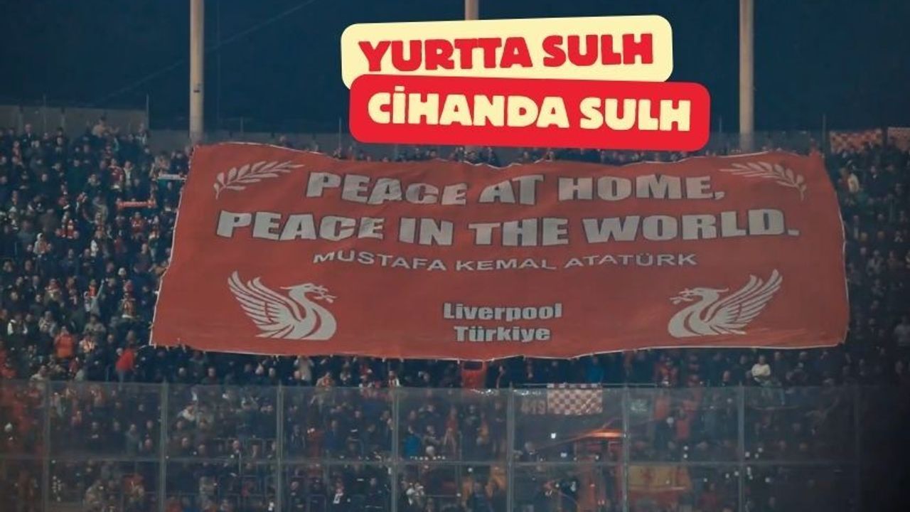 UEFA Şampiyonlar Ligi son 16 turu ilk maçında Galatasaray ile karşılaşan Liverpool’un taraftarları, RAMS Park’ta Ulu Önder Mustafa Kemal Atatürk’ün barış mesajını içeren pankart açtı. İngilizce olarak “Yurtta sulh, cihanda sulh” yazılı pankart, konuk takım tribününde sergilendi.