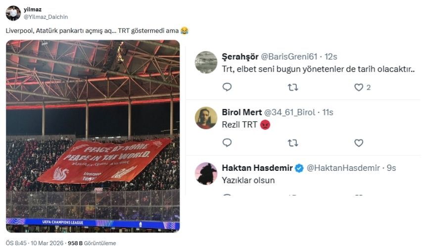 Galatasaray'ın 1-0 galibiyetiyle sonuçlanan Şampiyonlar Ligi çeyrek final ilk maçı, yayın hakkı elinde bulunan TRT1 kanalından yayınlandı. AKP - MHP İktidarının sözcüsü haline getirilen devletin kanalı TRT, bu görüntüyü ekrana getirmedi. Sosyal medyada tepki yağdı.
