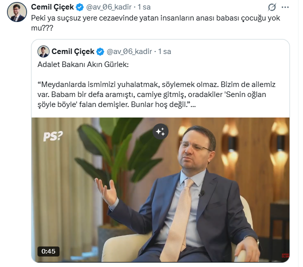 Adalet Bakanı Akın Gürlek, yargı mensubuyken hedef gösterilmesinin ailesini etkilediğini anlattı. Gürlek, "Babam bir defa aramıştı, işte camiye gitmiş, oradakiler demiş işte senin oğlan şöyle böyle falan. İnsan etkileniyor. Yani ben etkilenmiyorum çok şükür ama sonuçta mutlaka herkesin bir ailesi var, bunlar etkileniyor. Bunlar bence hoş değil" dedi.