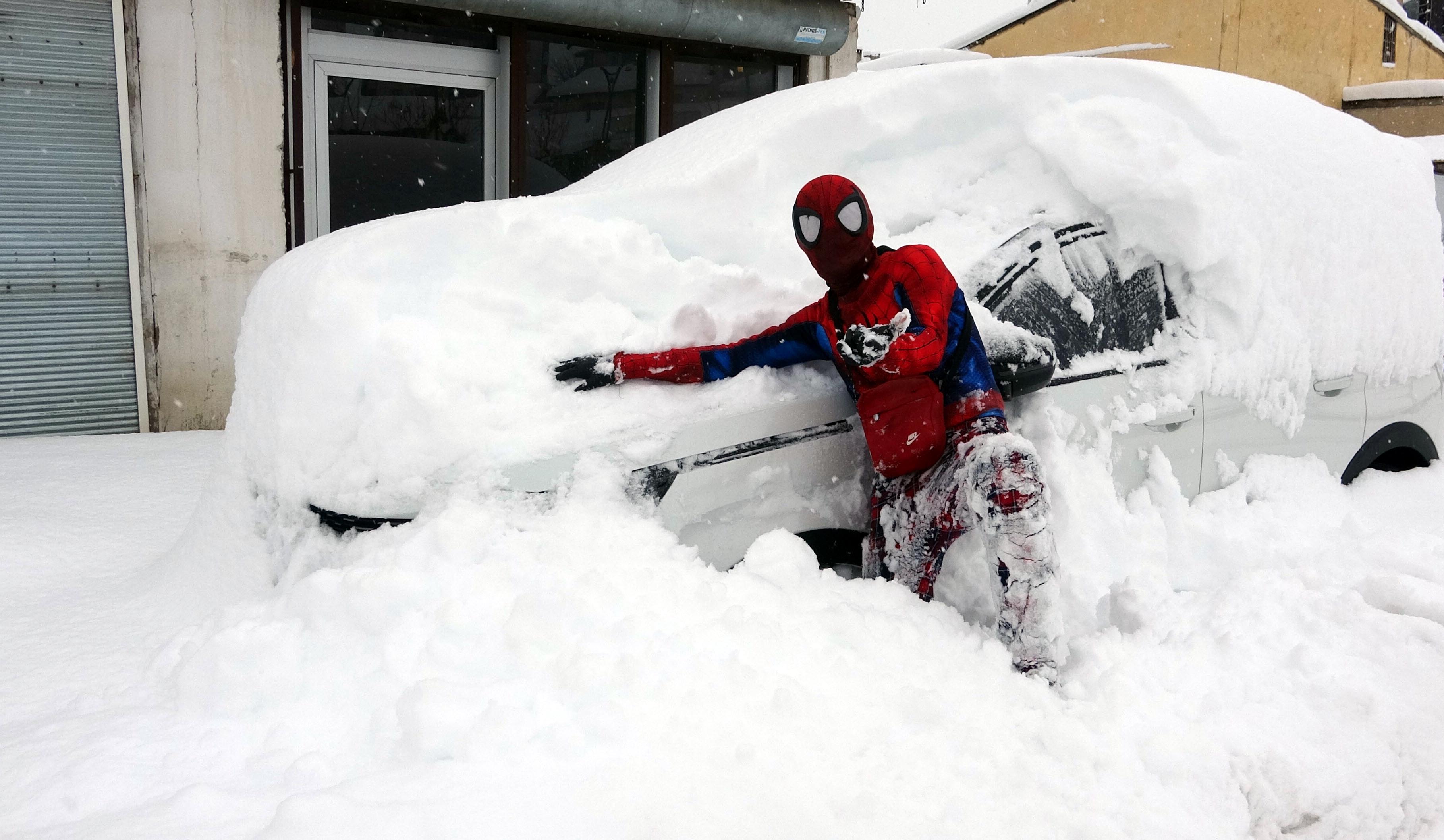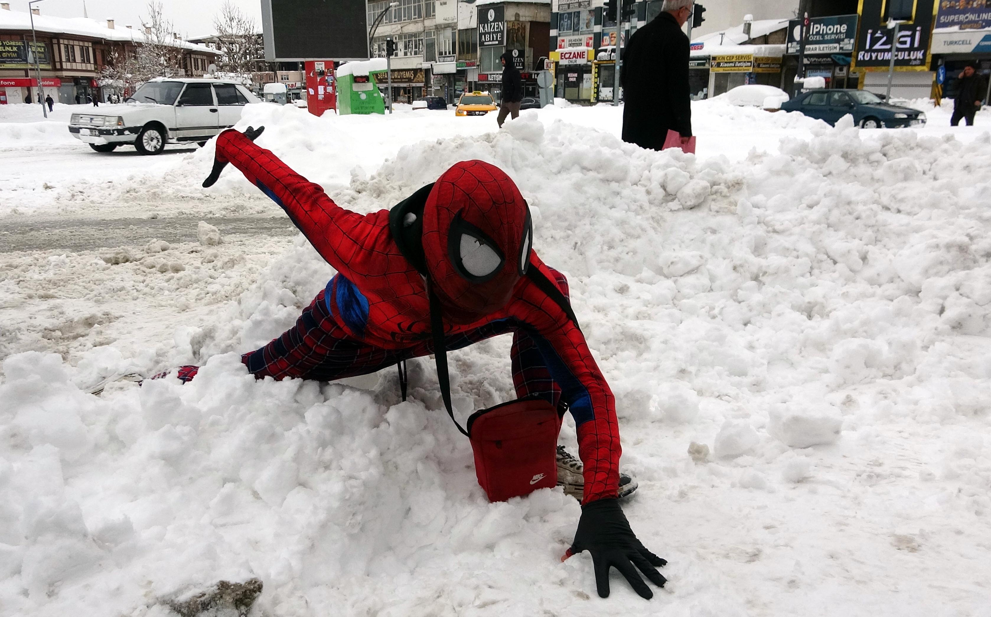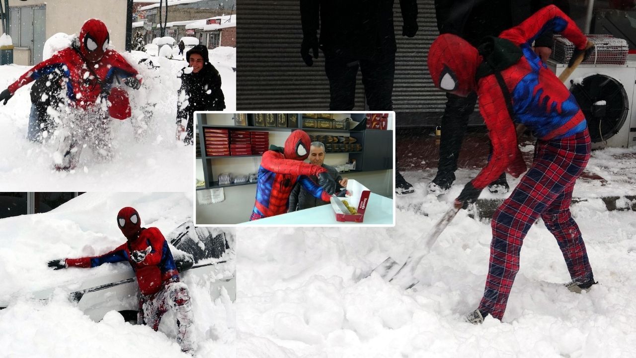 Kaldırım temizleyen 'Örümcek Adam' Ayaz Salih Koç, çocuklarla kar topu oynadı.