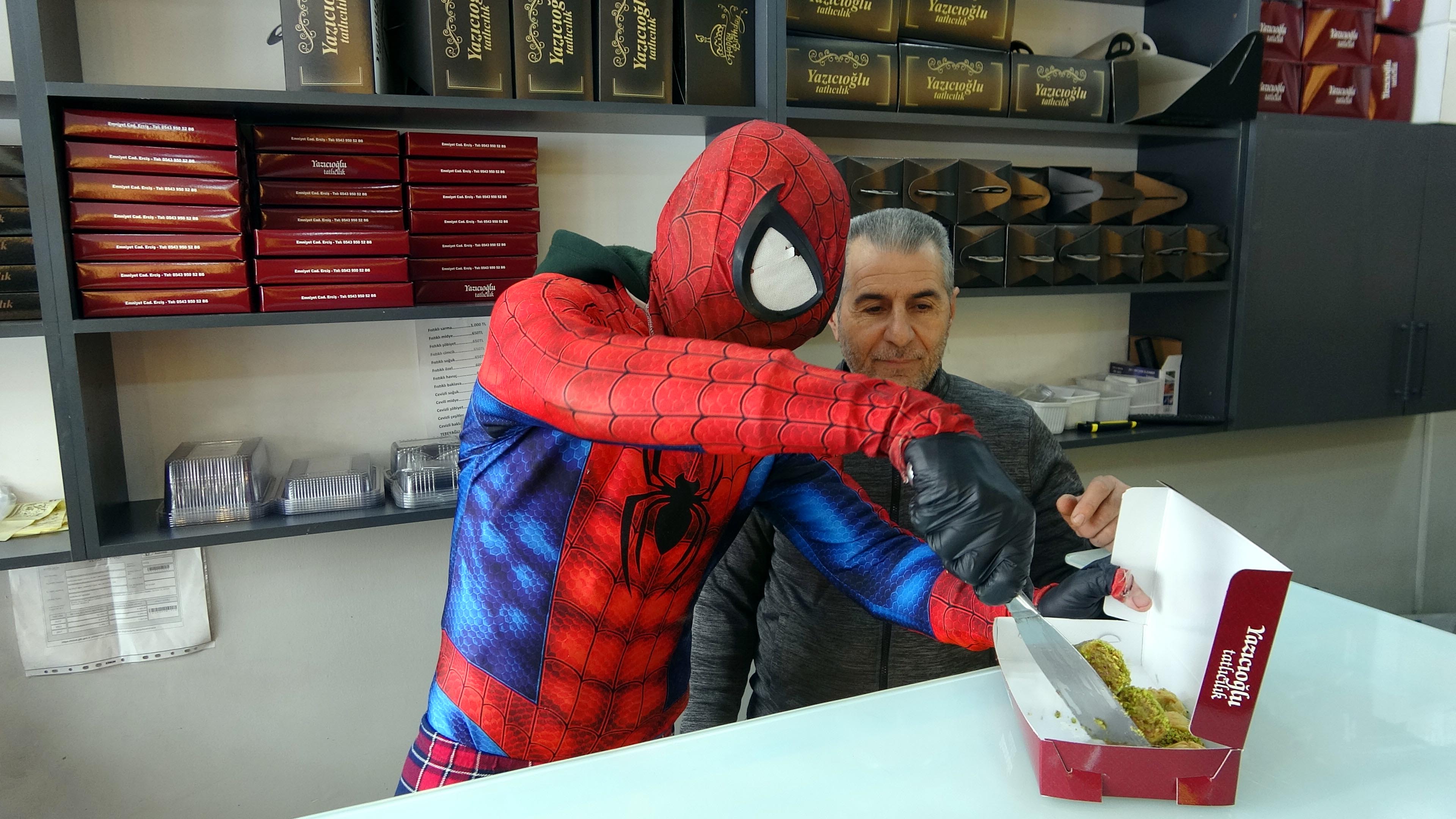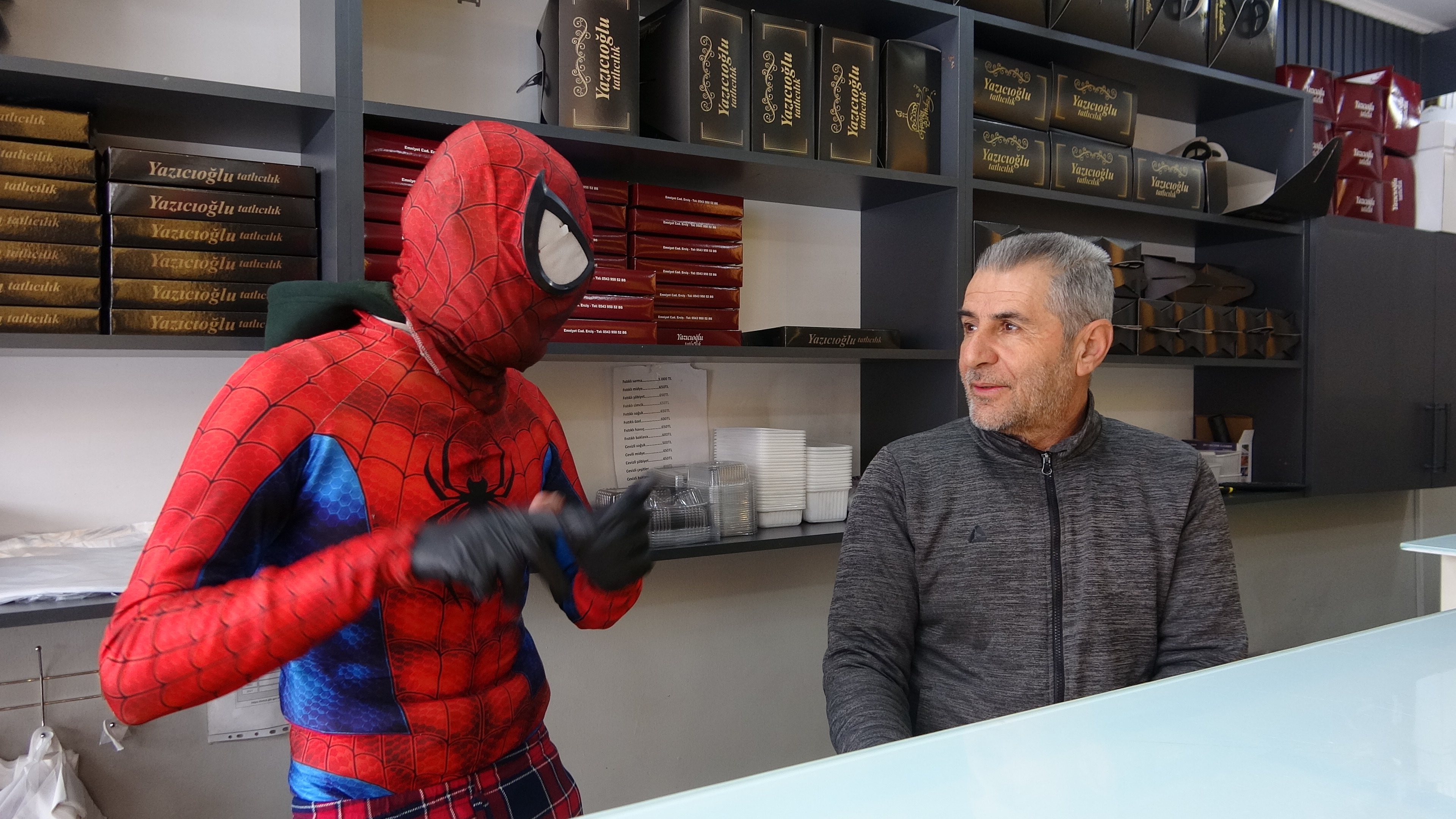 Erciş’te sokaklarda dolaşan Koç, depremde yakınlarını kaybeden esnaf Murat Kaya’yı dükkanında ziyaret etti. Örümcek Adam kostümüyle karşısında Ayaz Salih Koç’u gören Kaya, şaşkınlığını gizleyemedi.