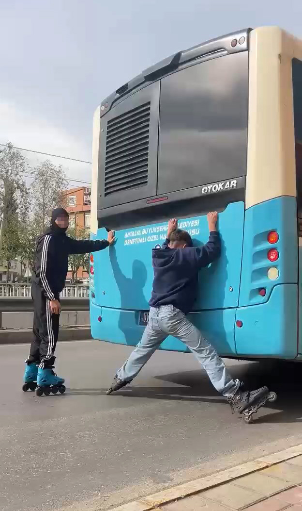 Antalya'da patenli çocukların halk otobüslerinin arkasına tutunarak yolculuk yapması, hem kendi canlarını hem de trafikteki diğer sürücüleri tehlikeye atıyor.
