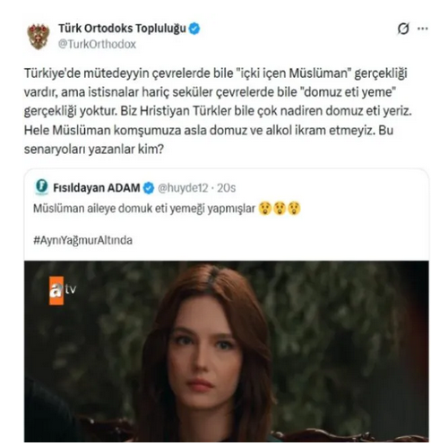 Söz konusu sahne sonrası Türk Ortodoks Topluluğu yazılı bir açıklama yaparak, “Türkiye'de mütedeyyin çevrelerde ‘içki içen Müslüman’ örnekleri görülebilir; ancak istisnalar dışında seküler çevrelerde dahi ‘domuz eti yeme’ yaygın bir gerçeklik değildir. Biz Hristiyan Türkler bile çok nadiren domuz eti yeriz. Müslüman komşumuza ise asla domuz eti ya da alkol ikram etmeyiz. Bu senaryoları yazanlar kim?” ifadelerini kullandı.