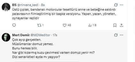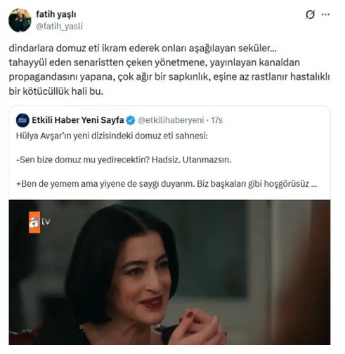“Dindarlara domuz eti ikram ederek onları aşağılayan seküler... Tahayyül eden senaristten çeken yönetmene, yayınlayan kanaldan propagandasını yapana, çok ağır bir sapkınlık, eşine az rastlanır hastalıklı bir kötücüllük hali bu.”