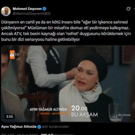 ATV’de yayınlanan “Aynı Yağmur Altında” dizisinin ikinci bölümünde yer alan bir sahne sosyal medyada tartışma yarattı. Bölümde Hristiyan bir karakterin, muhafazakâr Müslüman bir aileye akşam yemeğinde domuz eti ikram ettiği sahne izleyicilerin tepkisini çekti.
