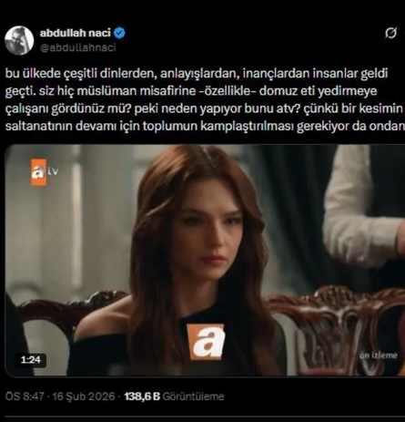 "Bu ülkede çeşitli dinlerden, anlayışlardan, inançlardan insanlar geldi geçti. Siz hiç Müslüman misafirine -özellikle- domuz eti yedirmeye çalışanı gördünüz mü? Peki neden yapıyor bunu ATV? Çünkü bir kesimin saltanatının devamı için toplumun kamplaştırılması gerekiyor da ondan."