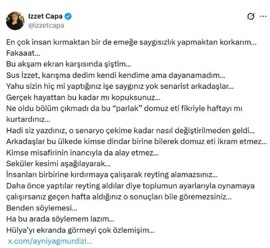 "En çok insan kırmaktan bir de emeğe saygısızlık yapmaktan korkarım… Fakaaat… Bu akşam ekran karşısında şiştim… Sus İzzet, karışma dedim kendi kendime ama dayanamadım… Yahu sizin hiç mi yaptığınız işe saygınız yok senarist arkadaşlar… Gerçek hayattan bu kadar mı kopuksunuz… Ne oldu bölüm çıkmadı da bu “parlak” domuz eti fikriyle haftayı mı kurtardınız… Hadi siz yazdınız, o senaryo çekime kadar nasıl değiştirilmeden geldi… Arkadaşlar bu ülkede kimse dindar birine bilerek domuz eti ikram etmez… Kimse misafirinin inancıyla da alay etmez… Seküler kesimi aşağılayarak… İnsanları birbirine kırdırmaya çalışarak reyting alamazsınız… Daha önce yaptılar reyting aldılar diye toplumun ayarlarıyla oynamaya çalışırsanız geçen hafta aldığınız o sonuçları bile göremezsiniz… Benden söylemesi… Ha bu arada söylemem lazım… Hülya’yı ekranda görmeyi çok özlemişim…"