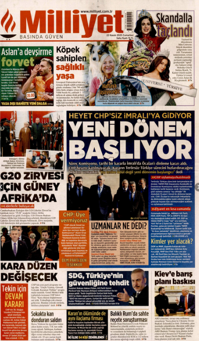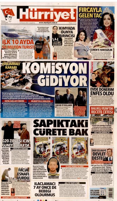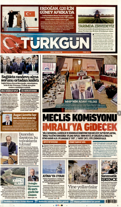 Türkiye Gazetesi de Öcalan ziyaretini manşetine taşımadı. Türkiye Gazetesi, kutu haberde “İmralı Seferi başlıyor” başlığını atıp MHP Genel Başkan Yardımcısı Feti Yıldız'ın fotoğrafına yer verdi.