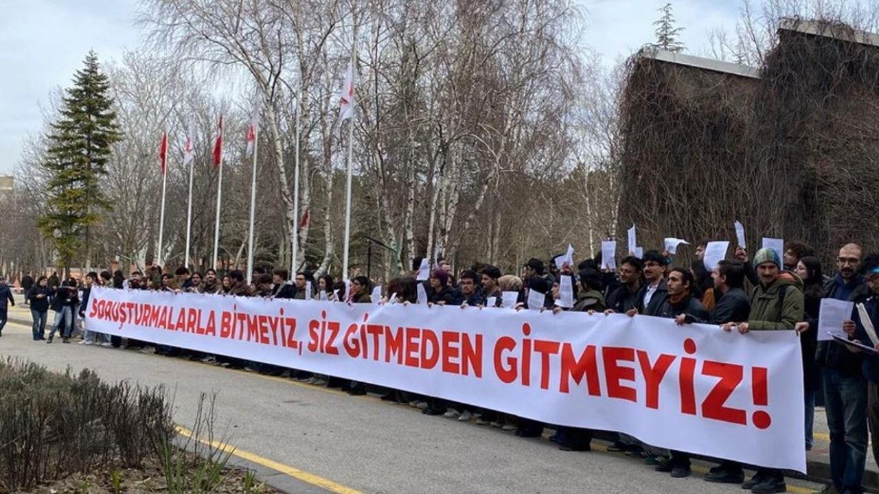 Kampüs içinden Rektörlük binası önüne yürüyen öğrenciler, "Soruşturmalarla bitmeyiz, siz gitmeden gitmeyiz” yazılı pankart açtı.