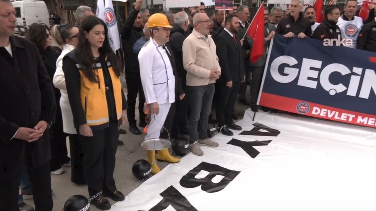 Kaya'nın açıklamasının ardından memurlar, ayak bileklerine "fatura, giyim, kira, kredi, gıda" yazılı topları zincirleyerek, aldıkları maaşlarla ayın ortasına zor geldiklerini anlattı.