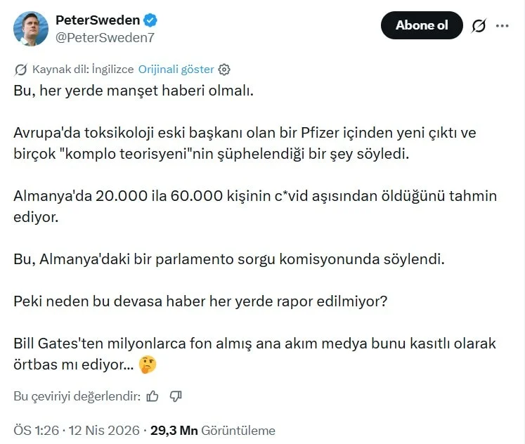 Sweden, Almanya’da görev yapmış eski bir uzmanın açıklamalarına dayandırdığı paylaşımında, Covid-19 aşılarıyla bağlantılı ölümlere ilişkin dikkat çekici rakamlar ortaya attı. Paylaşımda, Almanya’da 20 bin ila 60 bin arasında insanın aşılar nedeniyle hayatını kaybettiği öne sürüldü. Sweden, bu iddiaların ana akım medya tarafından yeterince gündeme taşınmadığını savundu.
