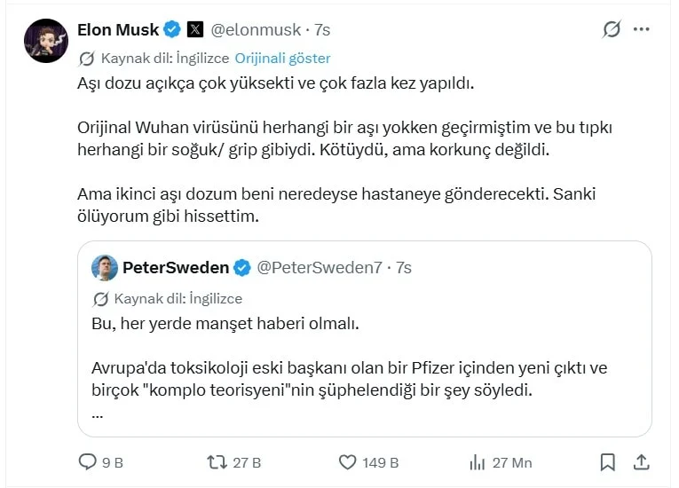 Söz konusu iddialar kısa sürede geniş yankı bulurken, SpaceX ve Tesla’nın sahibi Elon Musk da tartışmaya kişisel deneyimiyle dahil oldu. Musk, Covid-19’u aşı olmadan önce geçirdiğini ve sürecin “kötü ama yönetilebilir” olduğunu ifade etti.