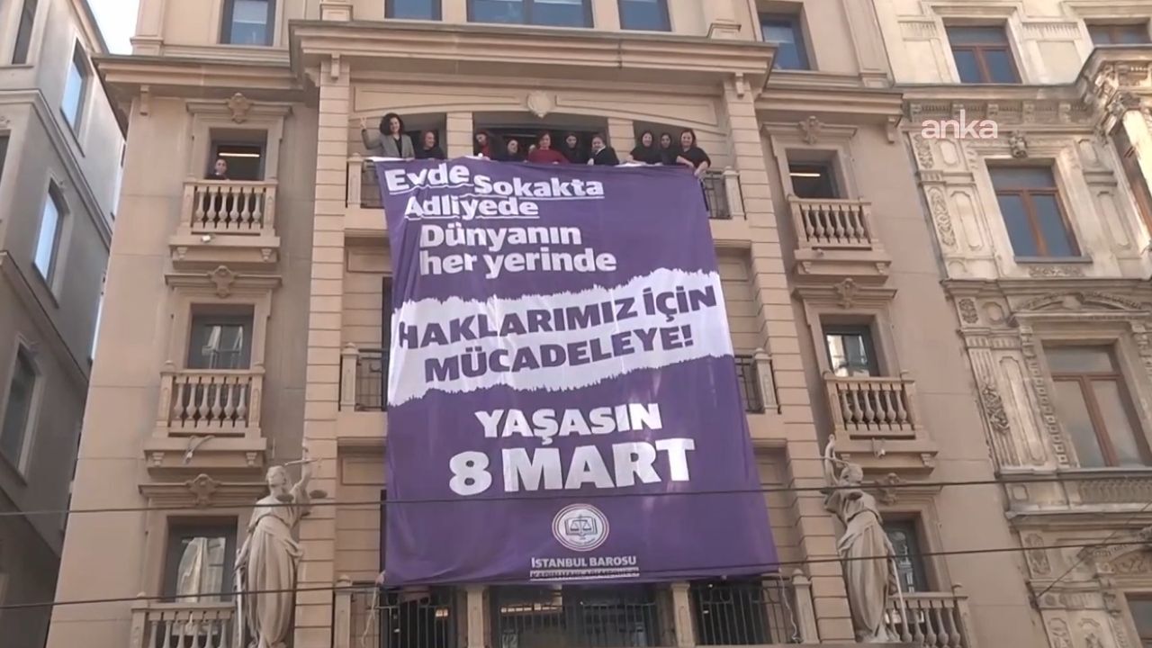 Kadınlar, Beyoğlu İstiklal Caddesi üzerinde bulunan İstanbul Barosu binasına “Evde, sokakta, adliyede, dünyanın her yerinde haklarımız için mücadeleye. Yaşasın 8 Mart” yazılı pankart astı.