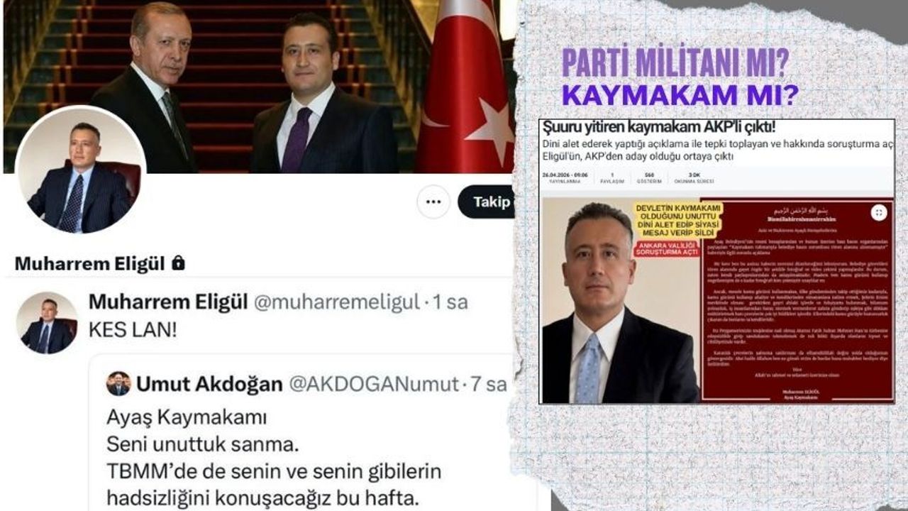 Dini alet ederek siyasi mesaj yayımlayan, CHP Milletvekili Umut Akdoğan'a 'Kes Lan' diye yazan ve daha önce AKP'den aday olduğu ortaya çıkan Ankara Ayaş Kaymakamı Muharrem Eligül hakkında soruşturma başlatılırken, Edirne Valiliği Hukuk Müşavirliği’ne görevlendirildi.