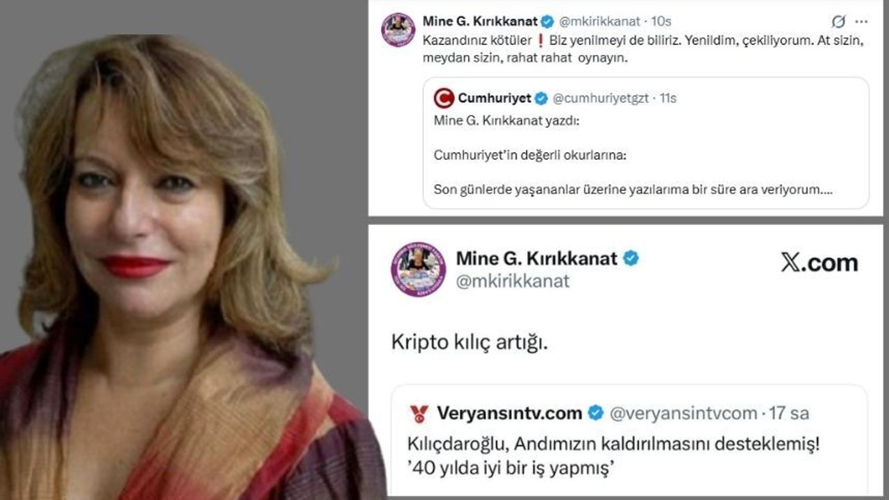 Sosyal medyada eski CHP Genel Başkanı Kemal Kılıçdaroğlu’na “Kılıç artığı” diyen ve Alevilerin tepkisini çeken Mine Kırıkkanat, Cumhuriyet gazetesinden ayrılığını “Kazandınız kötüler” diyerek duyurdu. Cumhuriyet yazarı Mine Kırıkkanat, "Kazandınız kötüler. Yenildim. At sizin, meydan sizin" dedi.