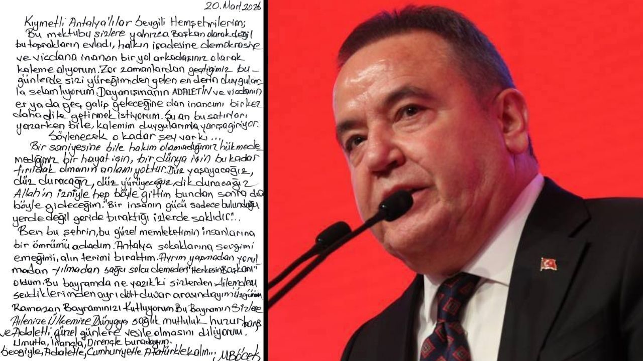 Antalyalılara hitaben kaleme aldığı mesajına Böcek “Kıymetli Antalyalılar, sevgili hemşehrilerim, Bu mektubu sizlere yalnızca başkan olarak değil, bu toprakların evladı, halkın iradesine, demokrasiye ve vicdana inanan bir yol arkadaşınız olarak kaleme alıyorum” sözleriyle başladı.