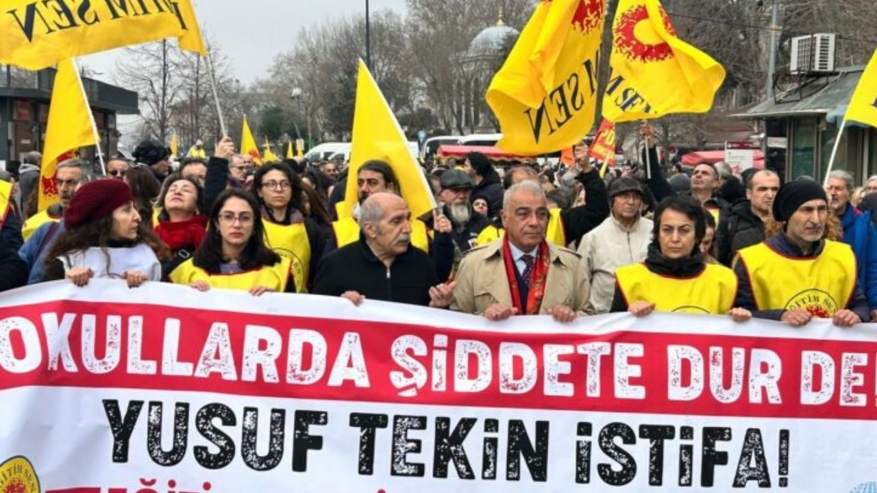 “Okulda şiddete dur de” diyerek Beyazıt’ta bir araya öğretmenler, İstanbul İl Milli Eğitim Müdürlüğü önüne yürüdü. Öğretmenler yürüyüş sırasında yaptıkları konuşmada bakanlığın öğretmenlerin sorunlarını göz ardı etmesinin, öğretmenleri değersizleştirmesinin sonuçlarının yaşandığını, bu cinayette Milli Eğitim Bakanı Yusuf Tekin’in de sorumluluğunun olduğunu vurguladı.