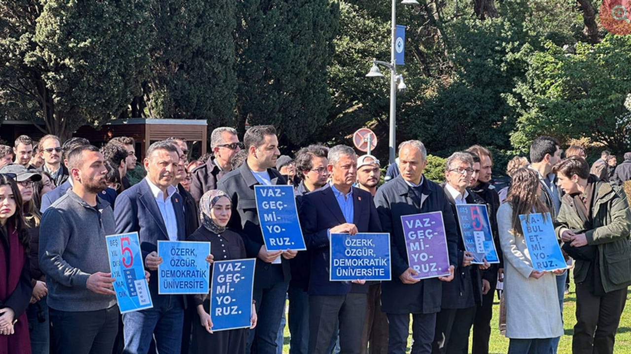 CHP Lideri, nöbetlerinin 1262. gününde akademisyenlerle birlikte rektörlük binasına sırtını döndü; “Özerk, özgür, demokratik üniversite” dövizi taşıdı.