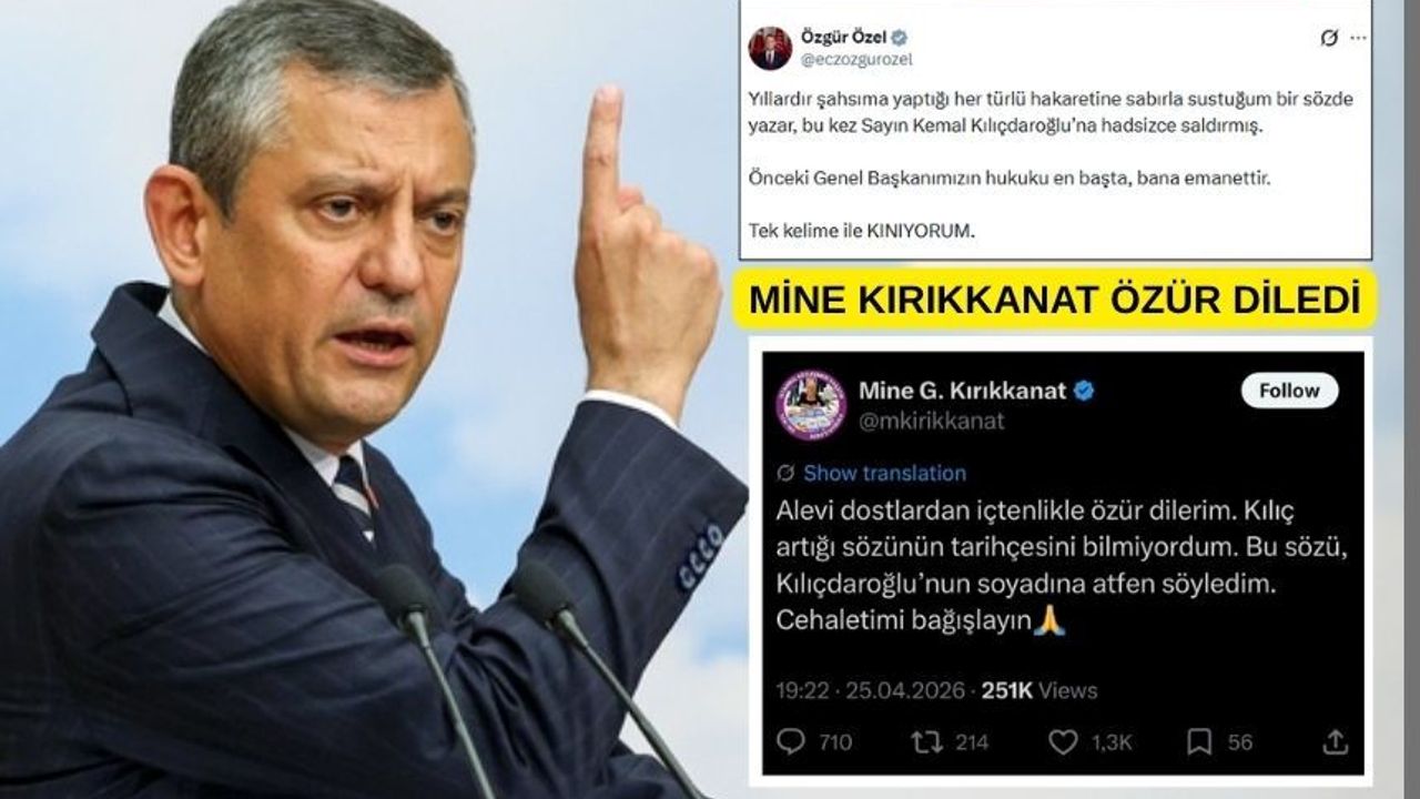 CHP lideri Özgür Özel, Cumhuriyet gazetesi yazarı Mine Kırıkkanat'ın CHP eski Genel Başkanı Kemal Kılıçdaroğlu için sosyal medya hesabından kullandığı "kılıç artığı" ifadesine tepki gösterip, "Önceki Genel Başkanımızın hukuku en başta, bana emanettir. Tek kelime ile kınıyorum" ifadelerini kullandı.