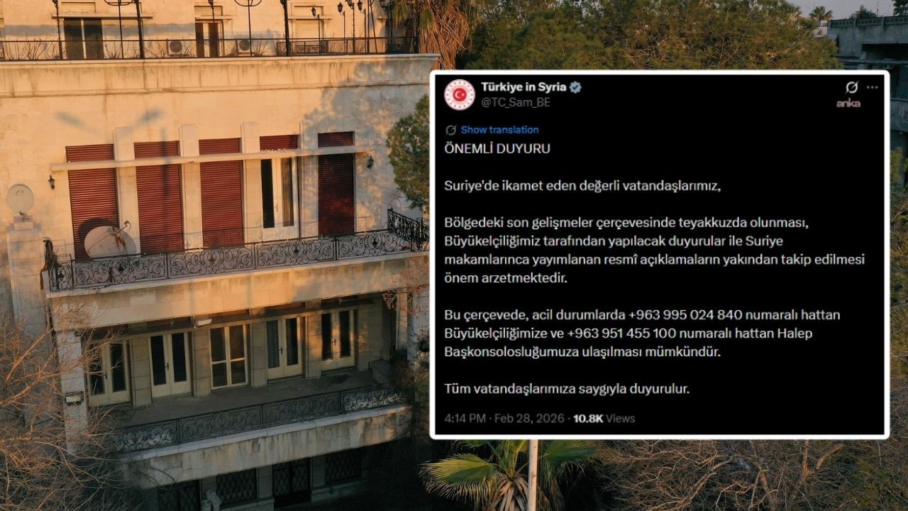 "Suriye'de ikamet eden değerli vatandaşlarımız, bölgedeki son gelişmeler çerçevesinde teyakkuzda olunması, Büyükelçiliğimiz tarafından yapılacak duyurular ile Suriye makamlarınca yayımlanan resmi açıklamaların yakından takip edilmesi önem arzetmektedir. Bu çerçevede, acil durumlarda +963 995 024 840 numaralı hattan Büyükelçiliğimize ve +963 951 455 100 numaralı hattan Halep Başkonsolosluğumuza ulaşılması mümkündür. Tüm vatandaşlarımıza saygıyla duyurulur."