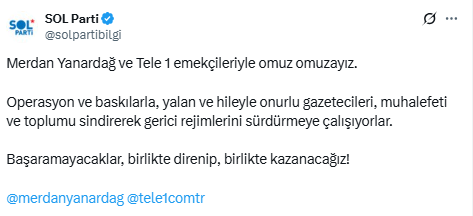 "Merdan Yanardağ ve Tele 1 emekçileriyle omuz omuzayız. Operasyon ve baskılarla, yalan ve hileyle onurlu gazetecileri, muhalefeti ve toplumu sindirerek gerici rejimlerini sürdürmeye çalışıyorlar. Başaramayacaklar, birlikte direnip, birlikte kazanacağız!"