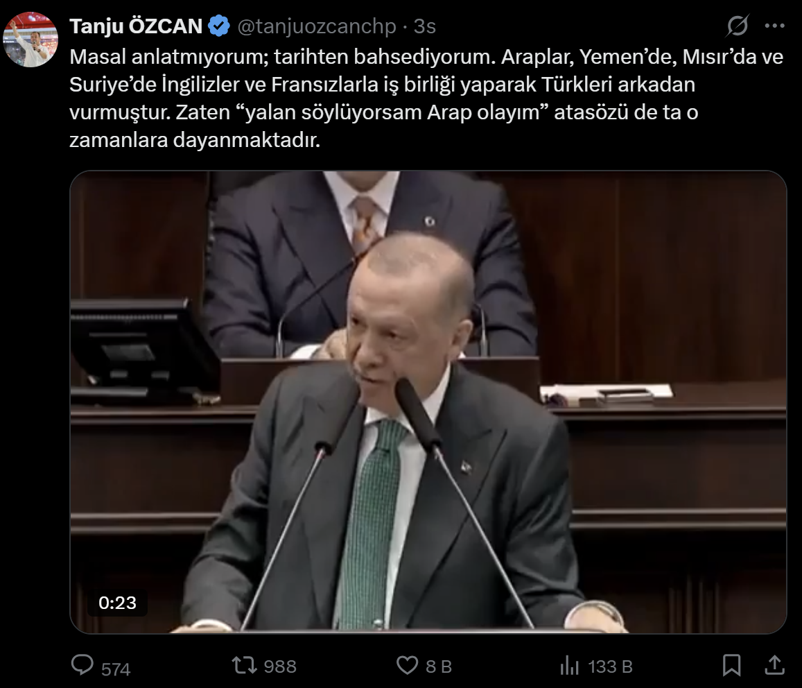 AKP'li Cumhurbaşkanı Recep Tayyip Erdoğan, bugün partisinin TBMM Grup Toplantısı’nda hem iç politikaya hem de bölge ülkeleriyle ilişkilere dair mesajlar verdi. Erdoğan, Türkiye’nin tarihsel bağlarına değindiği bölümde, yıllardır tekrarlanan söylemlere atıf yaparak, "Araplar bizi sırtımızdan vurmuş, hadi oradan..." ifadesini kullandı.
