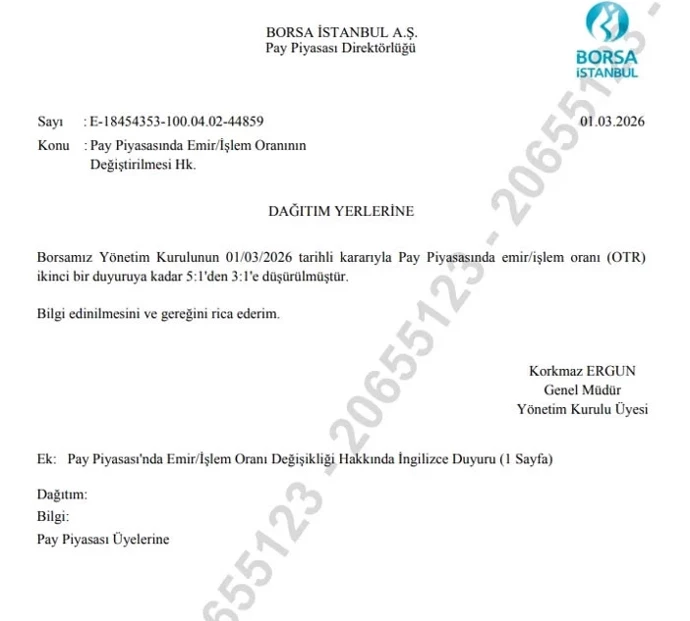 Öte yandan Borsa İstanbul AŞ, pay piyasasında yüksek frekanslı işlemleri yavaşlatmaya dönük bir düzenlemeye gitti. 1 Mart 2026 tarihli kararla emir/işlem oranı (OTR) ikinci bir duyuruya kadar 5:1’den 3:1’e düşürüldü.