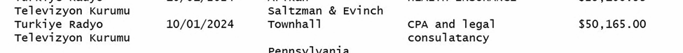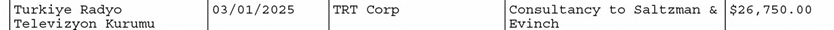 Bu arada, resmi bildirimlerde, Türk Hükümeti’nin ABD’de ‘lobi ve hukuk işlerini’ izlemek üzere kiralanan ‘Saltzman & Evinch, PLLC’ adlı şirkete, TRT’nin de binlerce dolar ödediği görülüyor. Günay Evinç’in ortağı olduğu şirkete ‘1 Ekim 2024’de, ’50 bin 165 dolar’ hukuk danışmanlığı ücreti ödendiği,