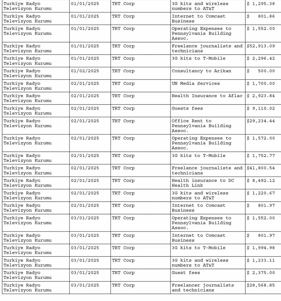 Adalet Bakanlığı ‘Foreign Agents Registration Act – Yabancı Temsilciler Kayıt Yasası- FARA’ya kayıtlı TRT- America Inc’nin ‘21 Mayıs 2025’ tarihli bildirdiği son masraf listesine göre, sadece bir kaç ayda ‘469 bin 873 dolar 90 cent’ harcamış.