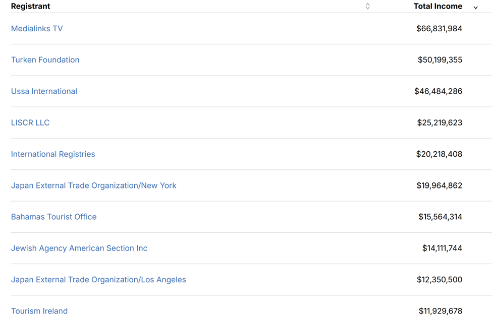 ABD’de ‘TURKEN Foundation Inc’ olarak şirketleşen Türken Vakfı, 2025 yılında ‘50 Milyon 199 Bin 355’ dolar gelirle, ABD’ye geçen yıl ‘66 Milyon 831 Bin 984’ dolar yatırım yapan Çin’in ‘Medialinks TV’ adlı şirketin ardından ikinci sıraya yerleşti.